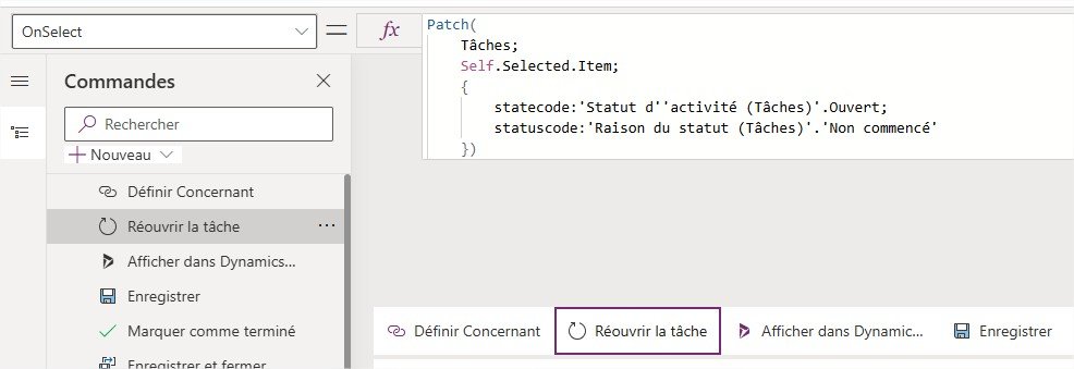 Dans Dynamics 365 / Dataverse, lorsque vous fermez une tâche (Task), il n’existe pas nativement de bouton pour la rouvrir dans la barre de commandes.